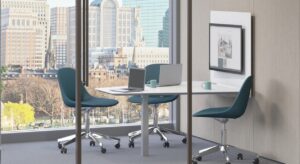Looking to the future, rather than suggesting hybrid businesses allocate fewer desks for their people, designers can direct them to efficient furniture that does more with less and can even help incentivize their staff to show up and do their best work. Workstations with a center spine that can be easily reoriented for different types of teams or even pulled away on casters for quick collaboration reduce the need for redundant spaces, giving businesses enough room to provide their employees the dedicated home base that behavioral research tells us they need in order to thrive.