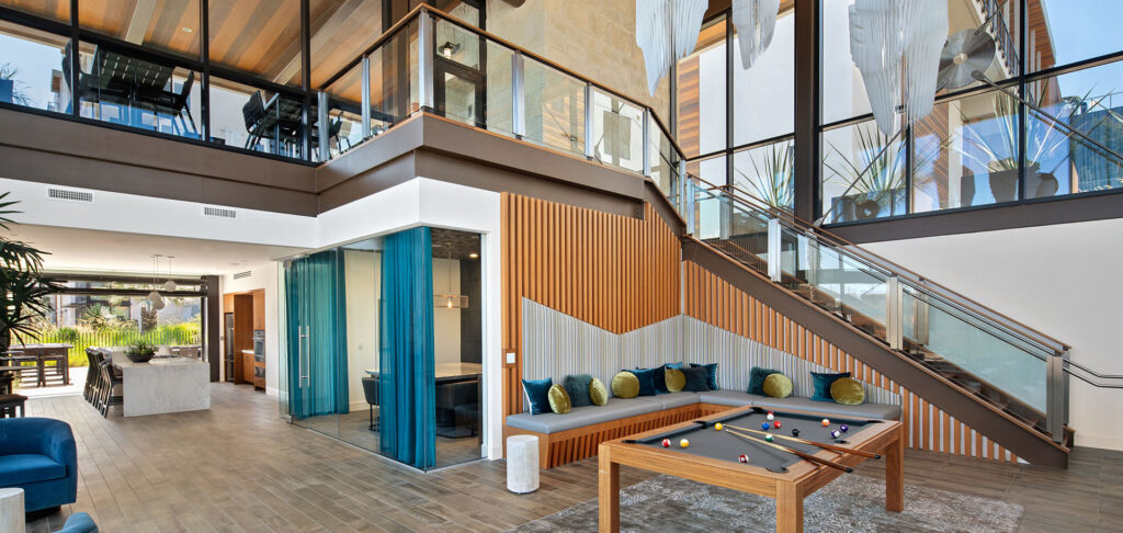 - Targeted toward millennials, the design introduces grounded moments within double-height volumes to create a welcoming, sculptural homestead that exceeded lease-up expectations before opening.
